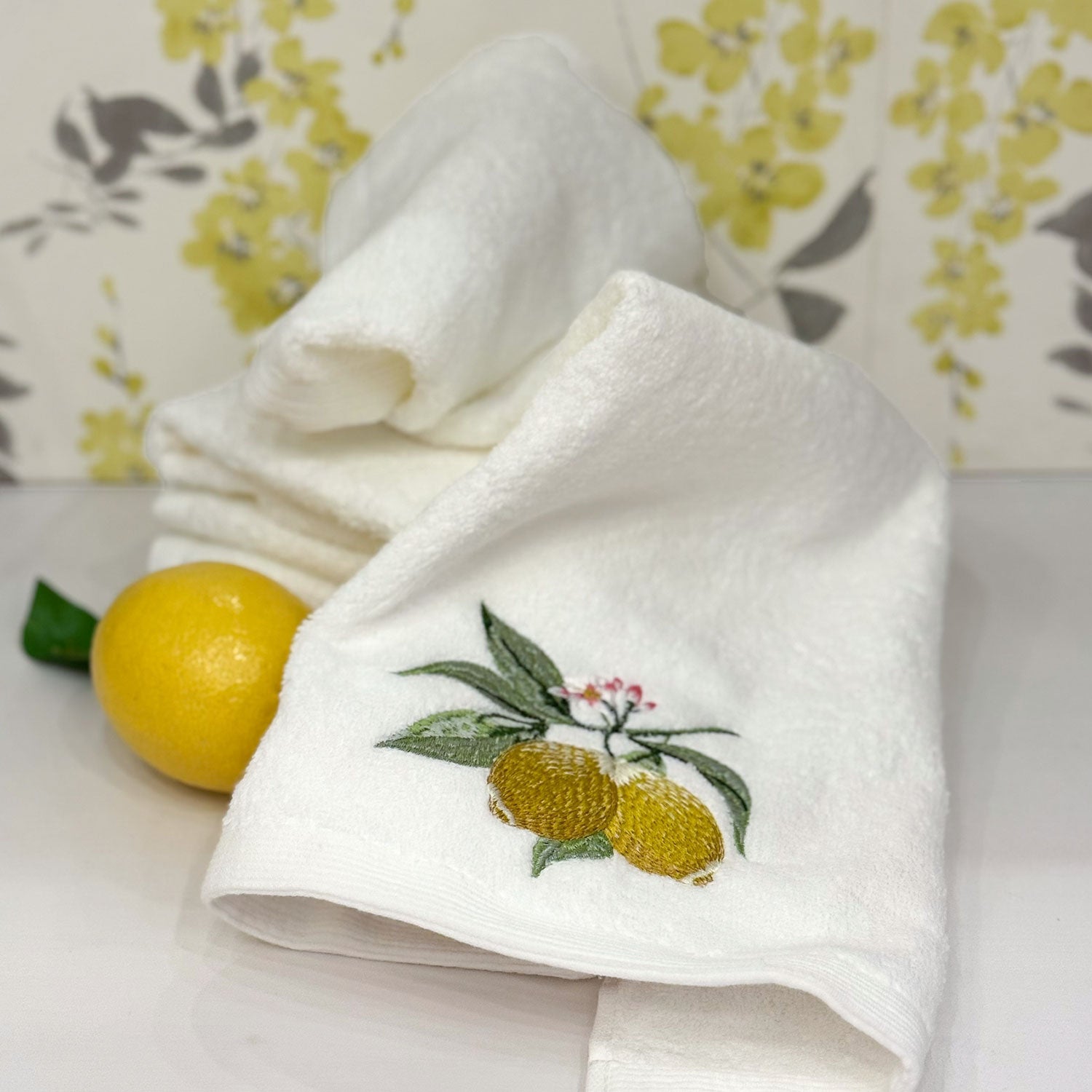 The gorgeous Lemons Hand Towel is made from 100% cotton, finished with an embroidered motif, and designed to absorb water to leave skin feeling refreshed and dry. Luxuriously soft and adorned with timeless artistry, this hand towel brings a touch of elegance to every cleanse. Indulge in beauty and comfort.