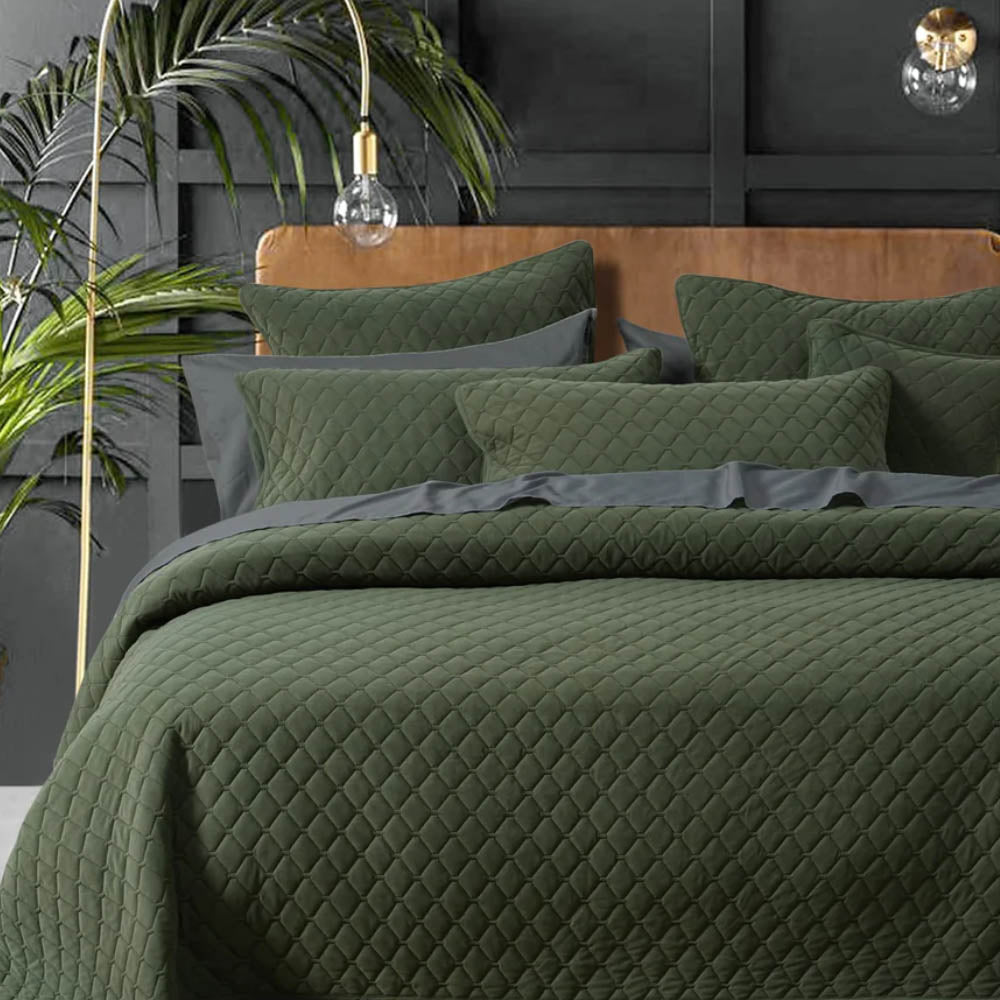 Understated and refined, Lester brings quiet depth to the bedroom in a perfect shade of forest olive. The smooth stone-washed velvet fabric catches the light with a subtle sheen, while the diamond-quilted pattern adds texture and balance. Finished with a tailored cuffed edge, it’s the kind of piece that makes a bed look instantly composed.