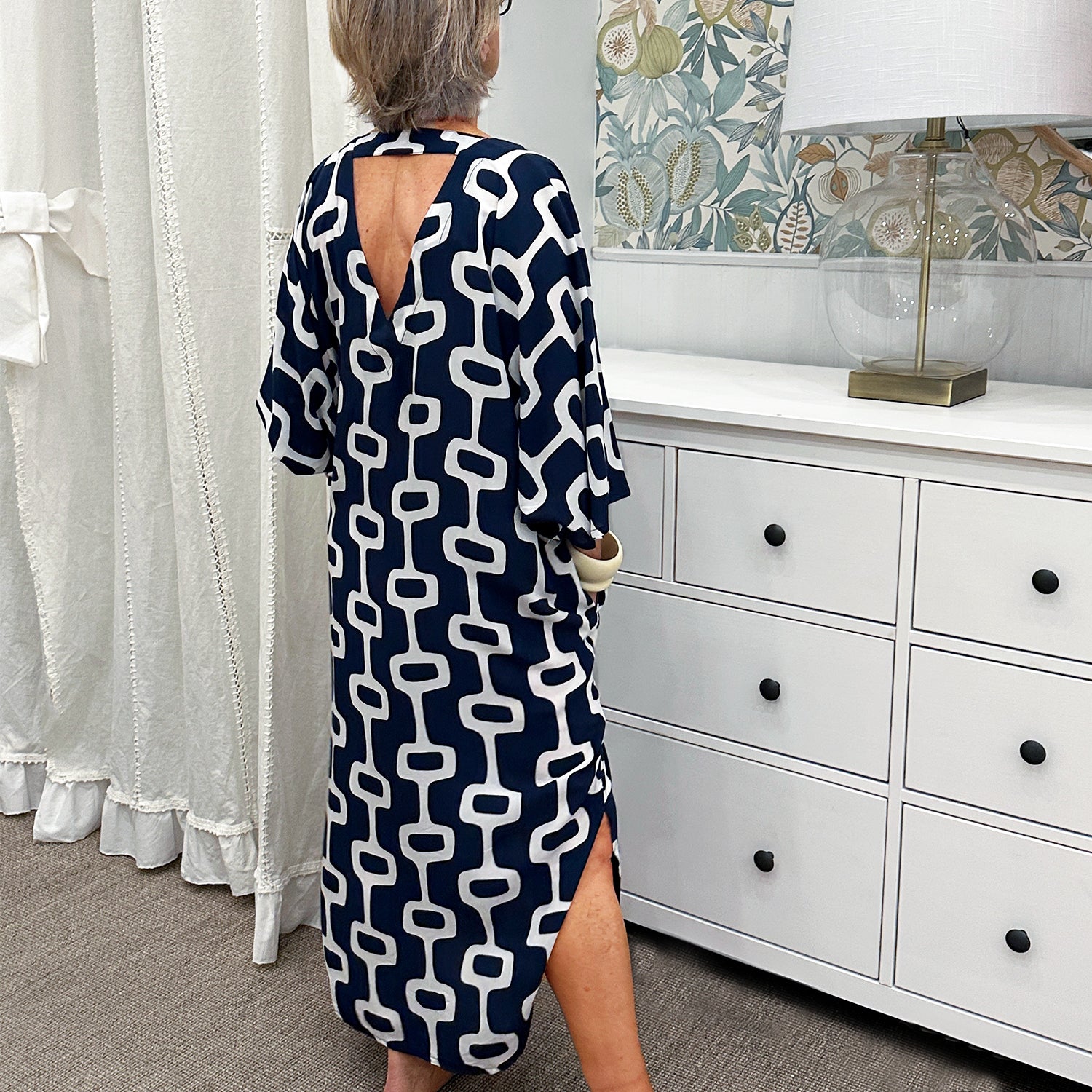Stay elegantly cool in our new Isla Dress in Marine. With its deep navy base and bold geometric print, this kaftan-style dress brings a modern edge to our new laid-back luxury collection. It’s the dress you reach for when you want comfort that still turns heads.