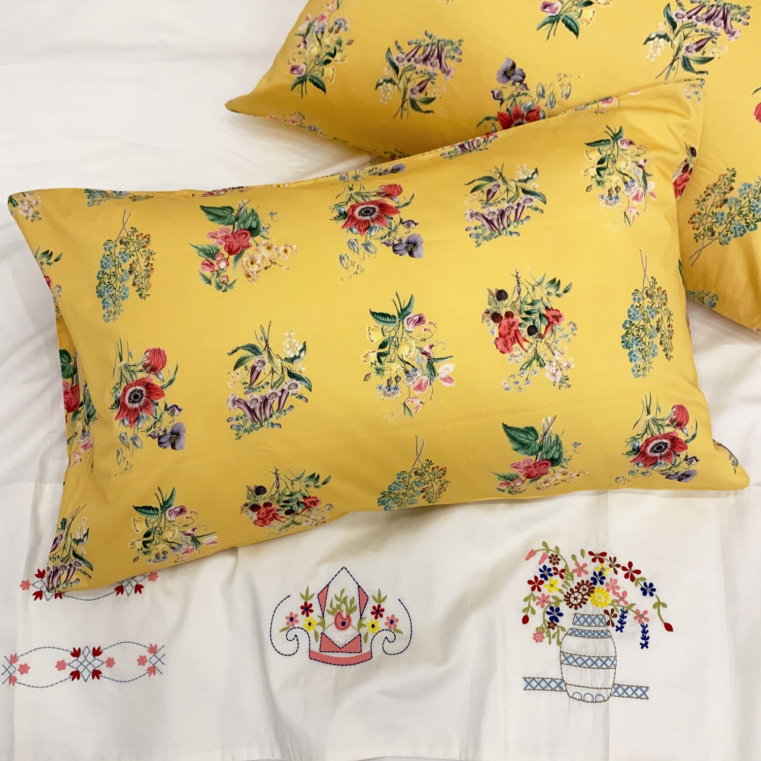 The 300TC cloth has a beautiful handle, drape and coverage while staying cool. The embroidery is finished cleanly on the reverse so it lies flat against your doona or blanket, and the cotton launders easily without losing colour or shape.