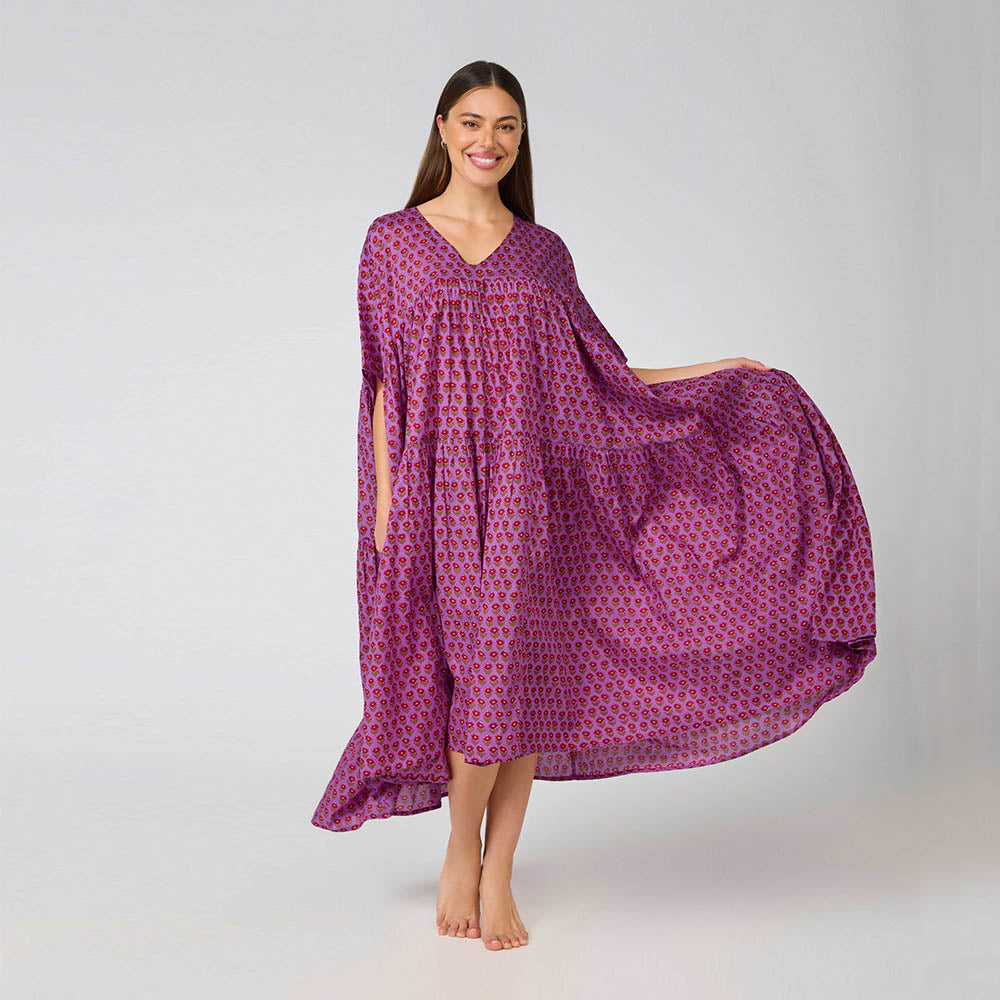 Vibrant and free-flowing, the Dahlia Kaftan is designed to bring comfort and colour to your everyday. Made from lightweight 100% lightweight cotton, it features an intricate hand block print in shades of magenta, plum and crimson.