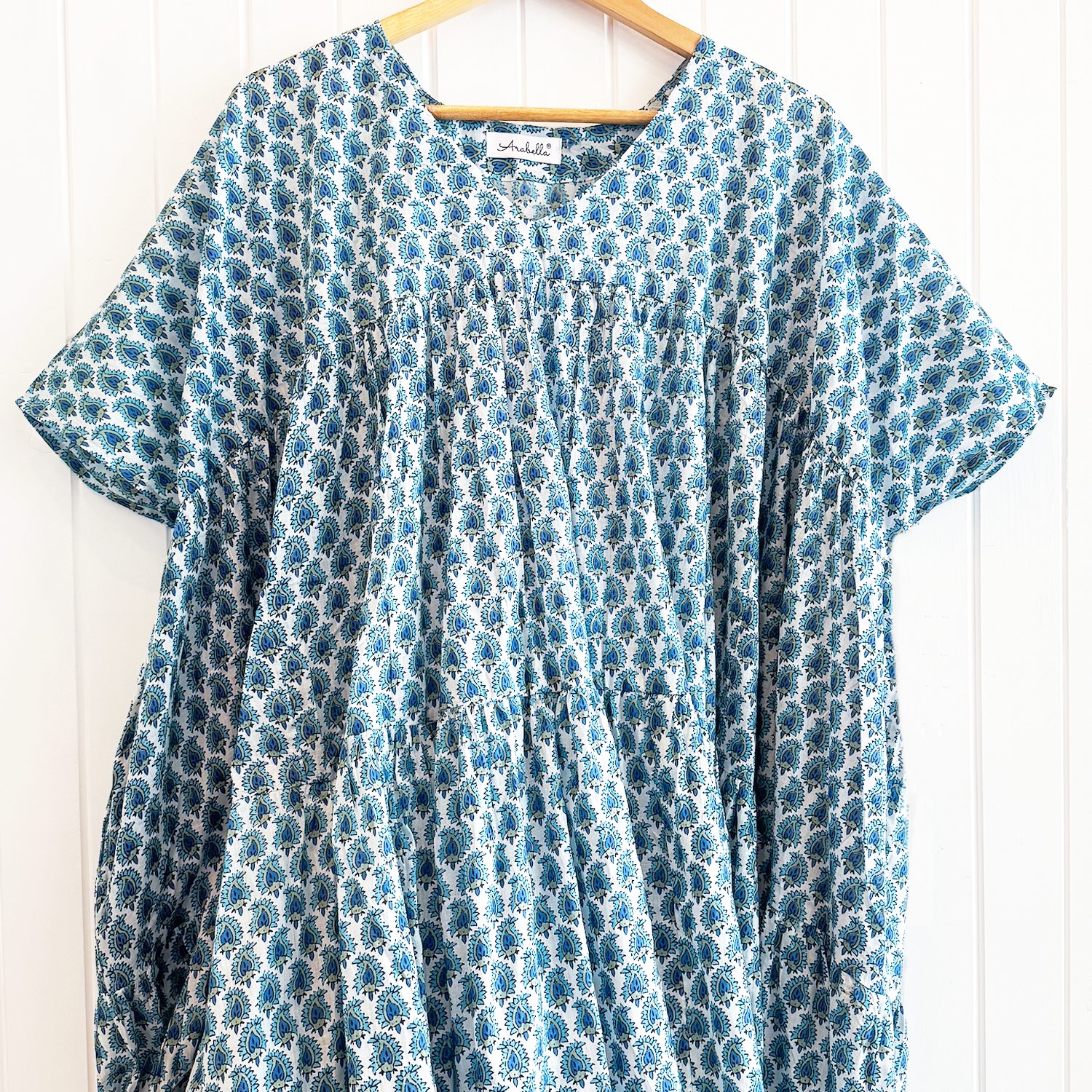 The intricate hand block print in soft sky and indigo tones brings a sense of calm and coastal freshness. Its tiered silhouette moves beautifully as you do, while the fluid drape ensures it flatters without feeling heavy. A gentle V-neckline and relaxed sleeves complete the look.