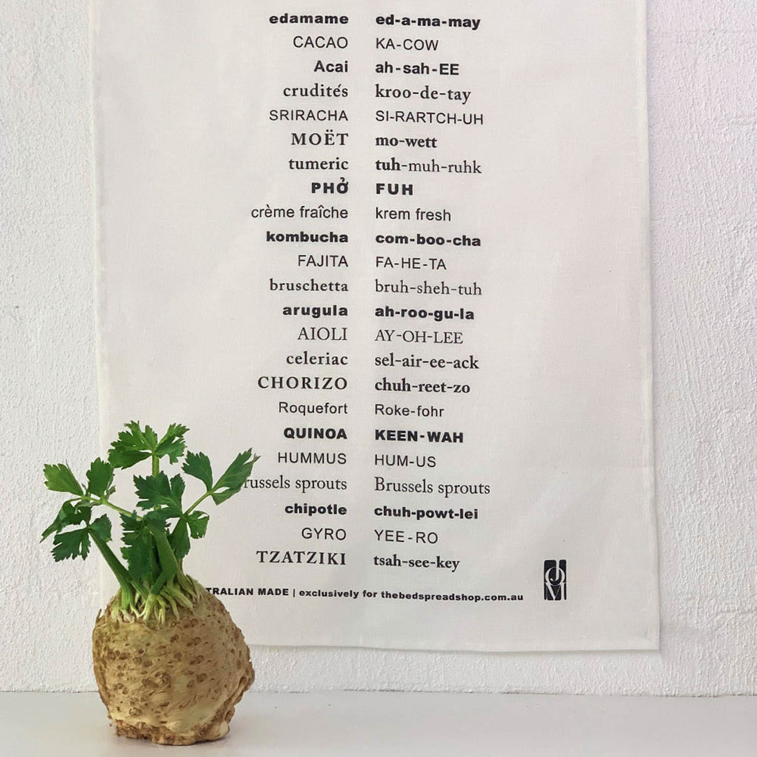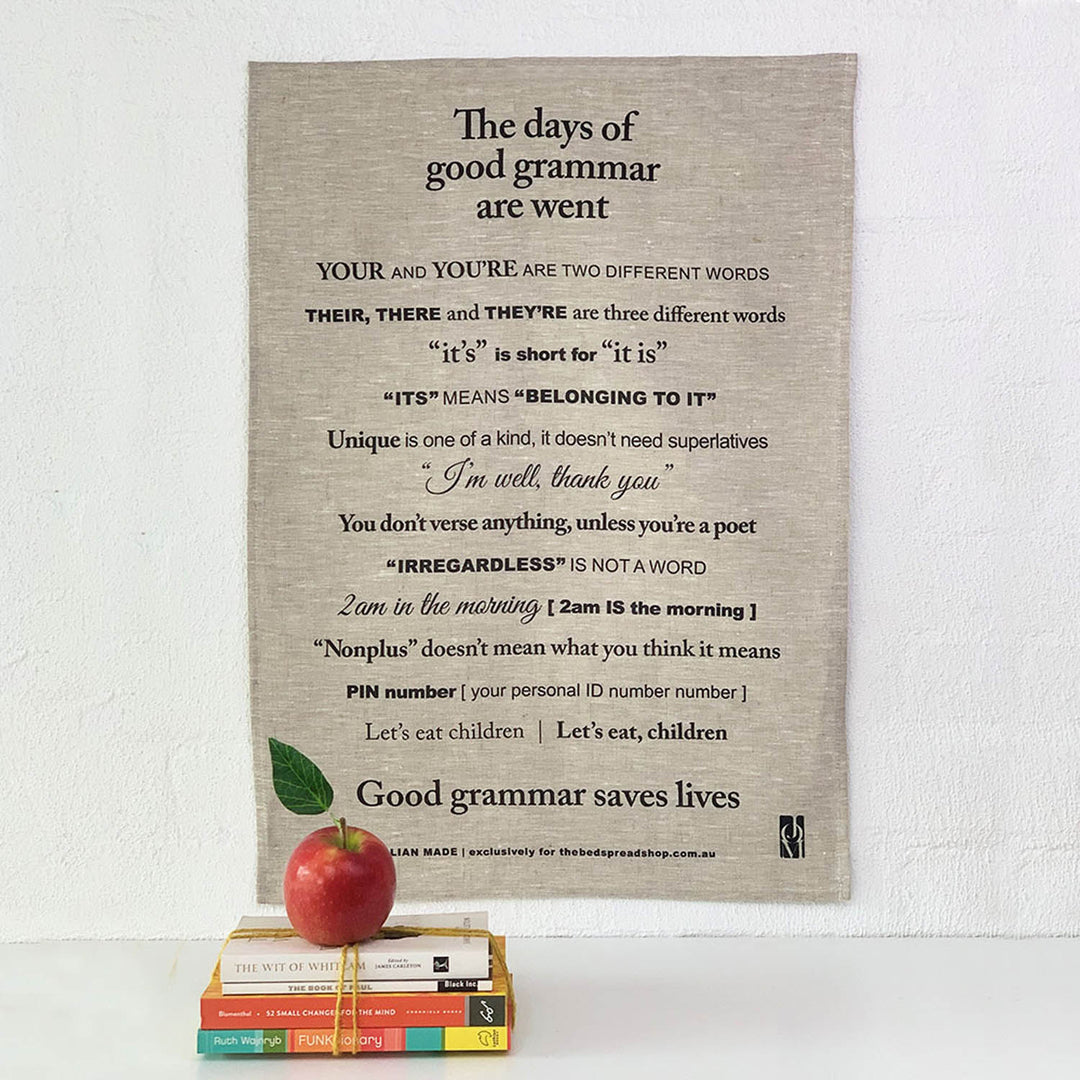 The Bedspread shop has a variety of Australian-made linen tea towels-ranging from the Good Grammar to the Phonetic Pantry. Our linen tea towels make the ideal housewarming or hostess gift and are perfect to send overseas to loved ones at Christmas time…or any time!